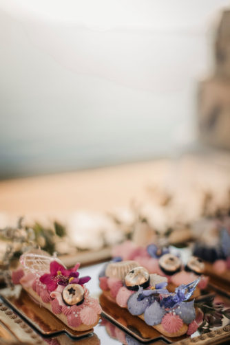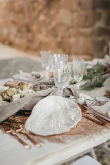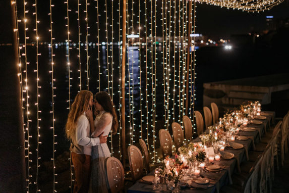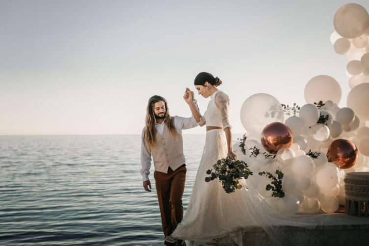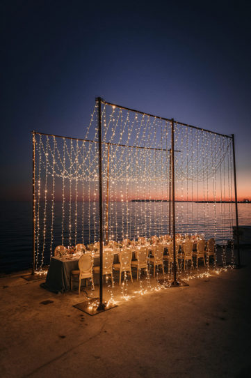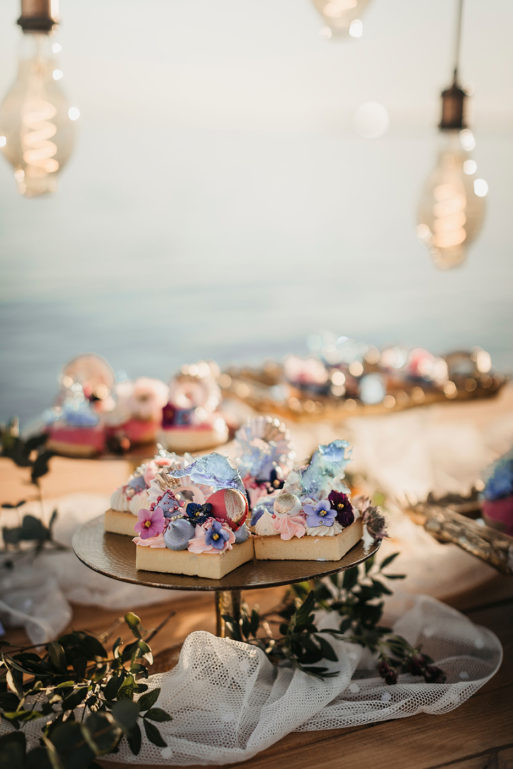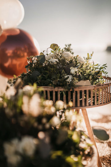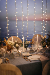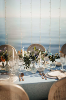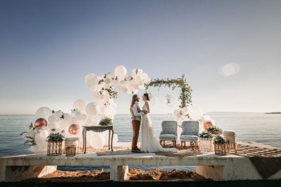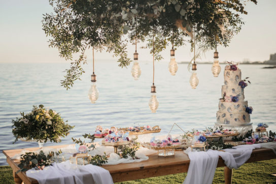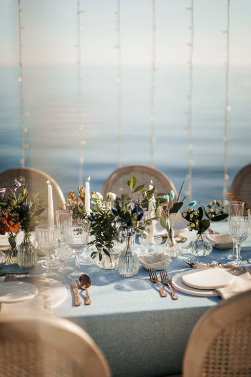 La ceremonia junto al mar se decoró, por Globofiesta Elche, con una estructura con globos que caen en cascada hacia un lateral en colores blancos, dorados combinados con flor natural. Los arreglos florales de Chitina combinan maravillosamente con la celebración de este romance mediterráneo. La colorida y apetecible mesa dulce, en tonos rosas y azules, fue diseñada y montada por Caperucita Cupcakes. Para la mesa nupcial, bajo una cortina de luz de Ledilux se añadieron centros de flor variada en jarrones cristal y candelabros con velas en consonancia sobre mantel azul de Mafesa Integral destacando las piezas de cerámica de diseño exclusivo de Laura Maldonado.  La papelería, en tonos azules, está caligrafiada a mano en papel hecho de forma artesanal por File du Soleil.
